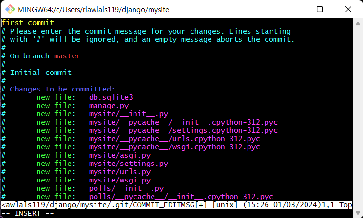 리눅스 명령어인 ‘i’를 누르고 commit 메시지로 “first commit”을 작성해줌